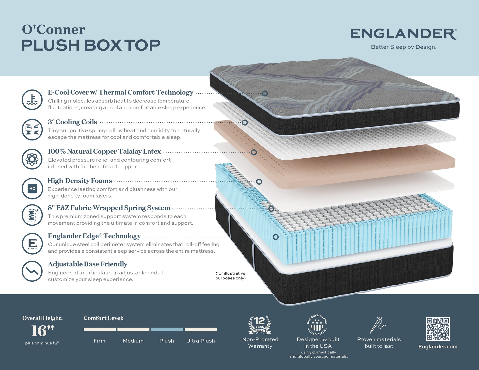 The O’Conner Plush Box Top delivers an ultra-soft, luxurious sleep experience backed by advanced cooling and responsive support. Its E-Cool Cover with Thermal Comfort Technology and 3° Cooling Coils work together to reduce temperature fluctuations and promote airflow, ensuring a cool, comfortable rest. High-density foams create a plush feel that lasts, while 100% Natural Copper Talalay Latex offers contouring pressure relief and the wellness benefits of copper, including natural anti-inflammatory properties.