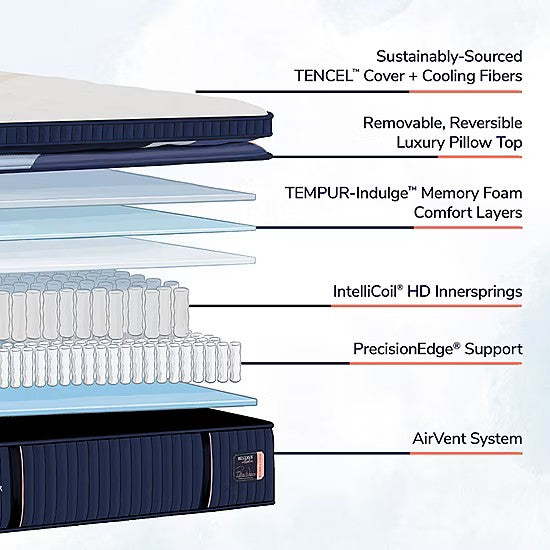 - TEMPUR-Indulge™ Comfort Foam: Relieves pressure and provides plush contour without losing firmness or bounce.